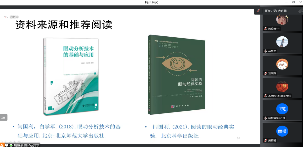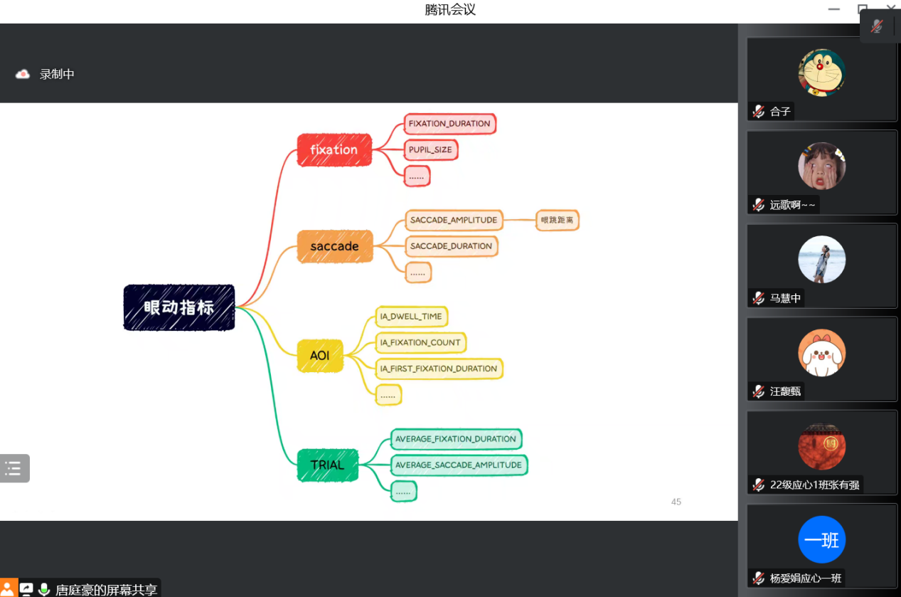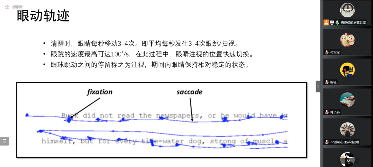唐庭豪同学围绕眼动追踪的原理和方法、眼睛的解剖结构、眼动轨迹、眼动指标等方面向大家进行了分享。365上市公司的眼动设备广泛应用阅读、审美、情绪、注意等研究领域。