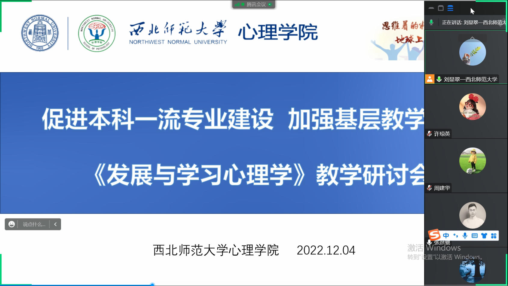 2022年12月4日,学院组织开展基层教学线上教学研讨活动。此次研讨的主题是“促进本科一流专业建设,加强基层教学组织《发展与学习心理学》教学研讨会”。会议由学院应用心理学系系主任刘显翠副教授主持,马小凤、杨宝琰、童丹丹、李世峰、袁彦、张彦驰、曹华、张建勋、尹玉龙、许琼英、周建华等任课教师参加了活动。
