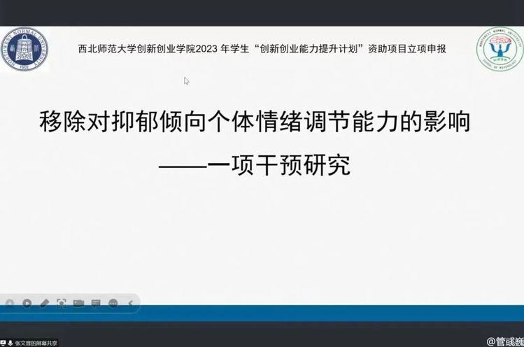 第三个项目名为《移除对抑郁倾向个体情绪调节能力的影响——一项干预研究》,答辩人为张文晋。张文晋同学的的汇报中参考文献包括了许多英文文献,根据张同学的汇报评委提出对于被试能否配的的担心,认为可以再做一份理论性研究,找到其他的效应。