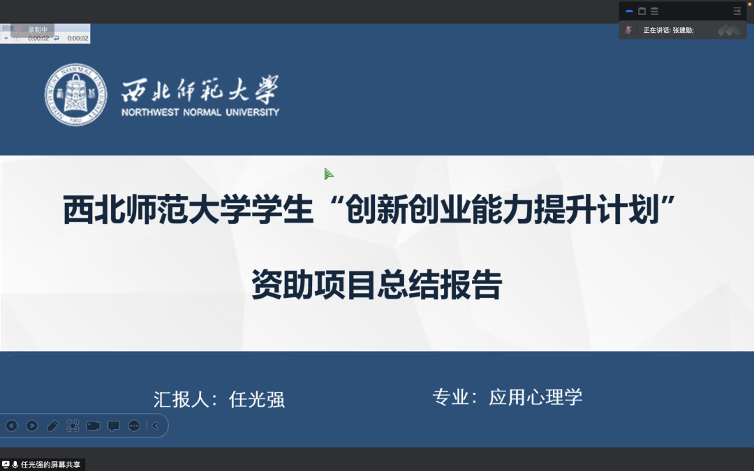 第三位总结的是2020级应用心理学1班任光强,他研究课题的题目是《社会排斥对抑郁的影响:心理资本的中介作用》。该研究探讨了抑郁对个体的身心健康产生的负面影响,提出了缓解抑郁的措施方法。老师认为该研究负责人按计划完成项目任务,研究数据翔实,符合结项要求。而对于心理资本、中介作用的论述严谨性方面的一些缺陷,老师们深入讨论后给出合理化建议。