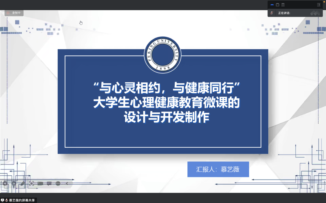 第四位总结的是2020级应用心理学1班慕艺薇,她展示了《“与心灵相约,与健康同行”一一心理健康教育系列微课”的设计开发与制作》相关成果。该成果形成了一套大学生心理健康的微课视频,让观众在观看视频中了解大学生心理健康,为他们自我调节提供帮助。老师们认为该项目取得了较为丰富的理论和实践成果,符合结项要求。对于吸引观众、获取流量方面的短板,评委老师建议该项目要注重回应疫情时代的心理健康需求。