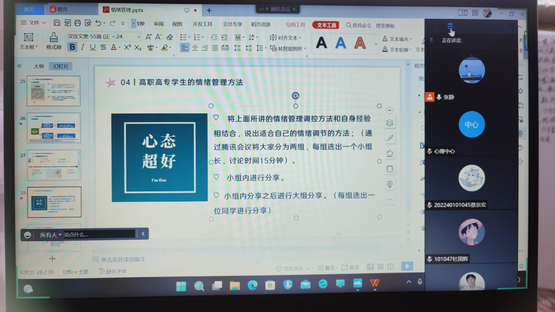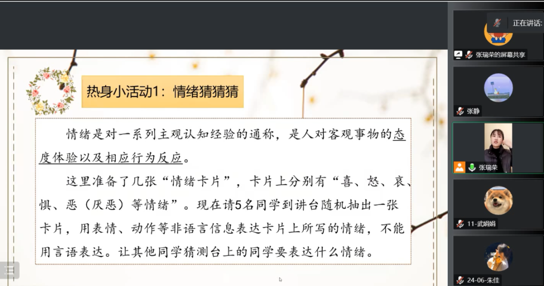 2022年11月14日至2022年11月18日,本周讲解的是与情绪管理这一主题的内容,11月14日,在丁月娥老师和张瑞荣老师的带领下进行听课,在听课过程中,我们收获颇多,赵新月说,在张老师的课堂之中,张老师运用的互动小游戏和举例都非常贴合主题,关于如何调动课堂氛围也让她有了更清晰的认识和领会,她也在学习到了该如何做一名优秀的青年教师。我们实习的同学还发现,在老师讲解过程中,老师是先用一个例子引入课题,再对课题进行讲解,在这个过程中,授课老师的课程设计是深入浅出、层层递进的,这样的设计更有利于同学们对知识的掌握。在这一周的后面几天,带教老师也安排了我们实习组的一位同学进行教育实践,先是由实习同学进行授课,授课结束由带教老师组织会议对这位同学的课程进行总结,指出上课过程中的优点与不足,首先是肯定了这位实习同学充分准备了课程内容,接下来指出这为实习同学在上课过程中对于知识没有内化、没开摄像头以及授课讨论环节讲解不清、与同学互动不足等缺点。在之后的课程中,实习同学也既是调整自己的状态以及改变自己的授课方式,弥补老师所提出的缺点。