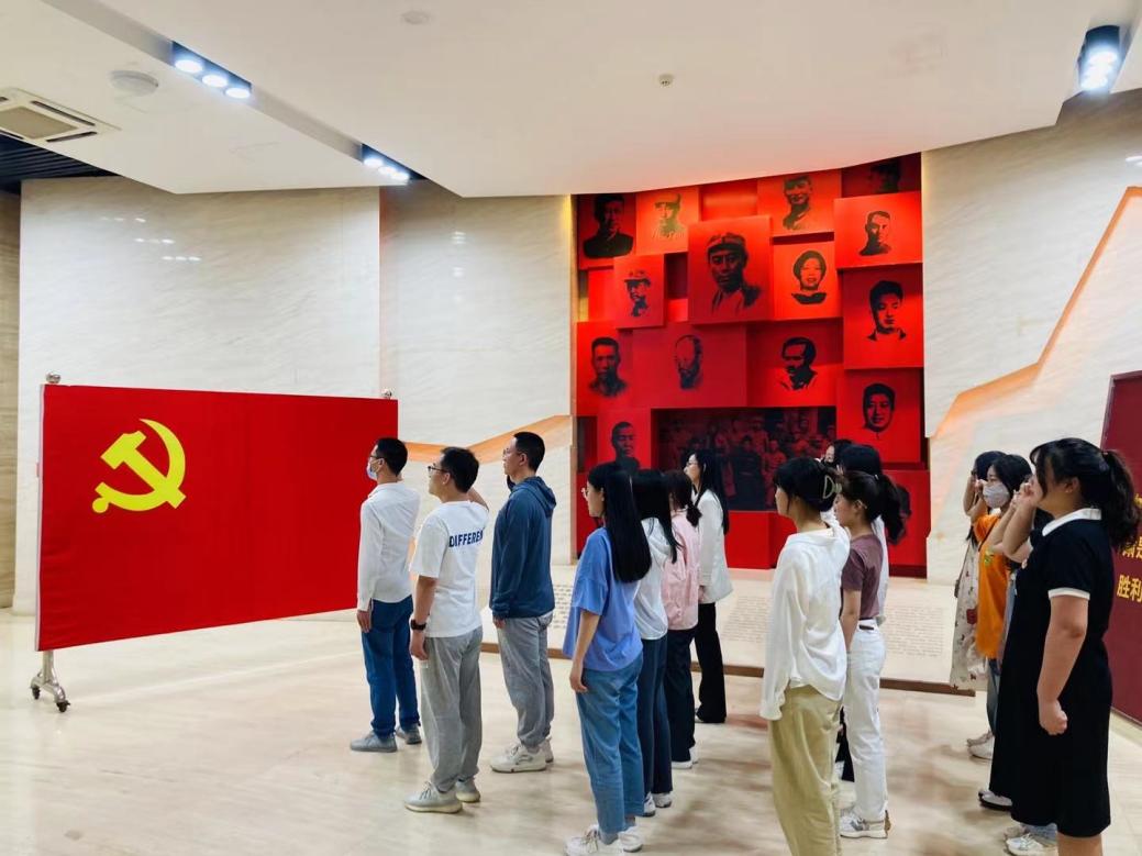 聆听着讲解员的生动讲述,瞻仰着宝贵的革命遗物,感受着革命先辈的艰苦奋斗历程,支部3名预备党员在支部书记张建勋老师的带领下,进行入党宣誓并为其佩戴党徽。同时,其他党员同志也面向党旗重温入党誓词,坚定理想信念,坚守初心使命。全体党员宣誓仪式庄严,在宣誓过程中,他们肃立并举起右手握拳,声音铿锵有力,表达了自己对加入中国共产党的坚定决心,表明了自己对共产主义事业的忠诚,通过不懈努力、奋斗为党和人们事业做出贡献。