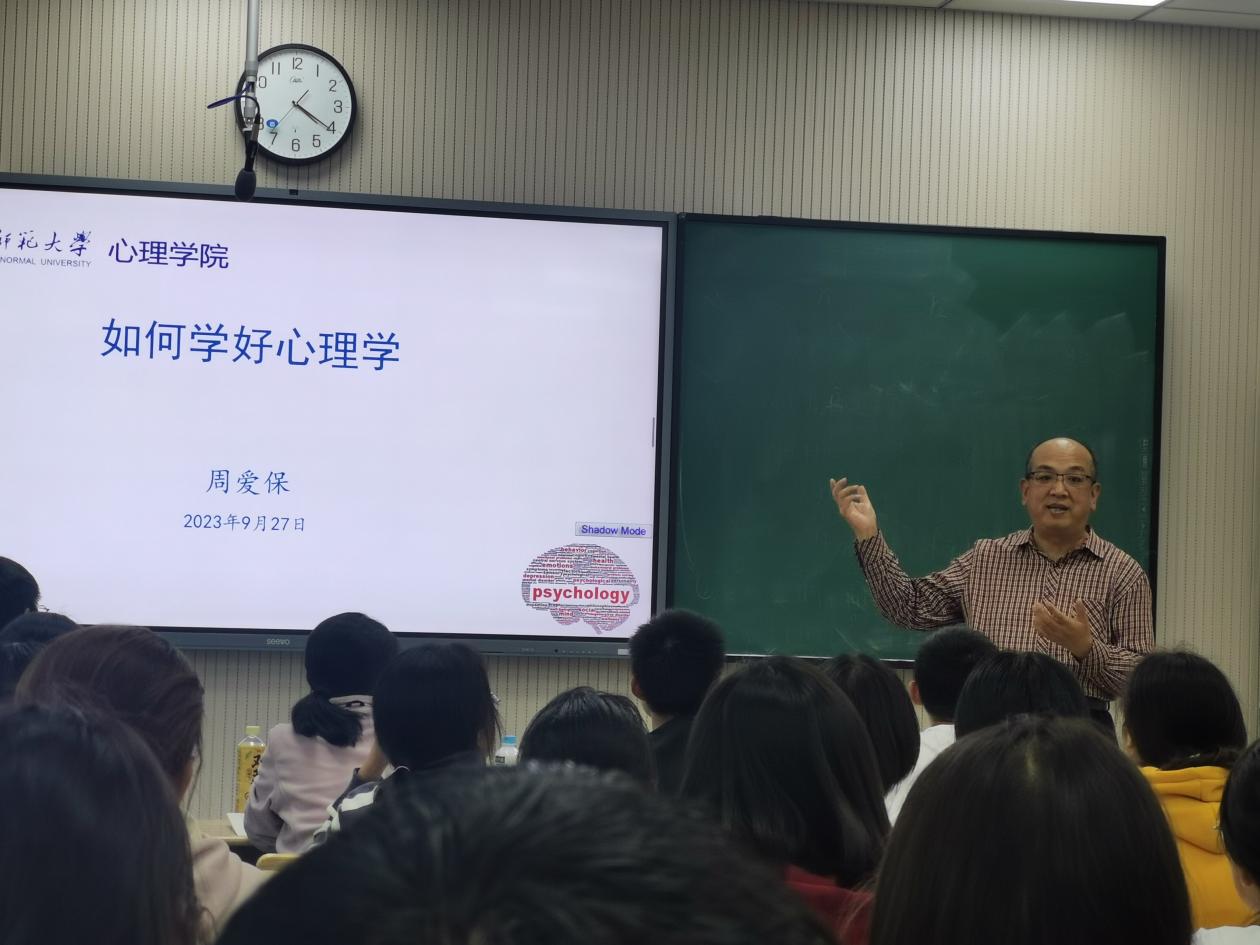 2023年9月27日,365上市公司2023级本科生新生在结束军训之后开始转入课程的学习。学院邀请周爱保教授分别为2023级心理学类1班、2班新生讲授“开学第一课”。在教学中,周爱保教授以“如何学好心理学”为题,围绕“心理学学什么”“心理学怎么学”“心理学有什么用”三个问题,结合心理学学科的发展历史和学术前沿,列举国内外心理学家的专业成长、学术贡献、社会成就等鲜活案例,介绍心理学专业的课程体系、专业知识的应用领域,分析心理学的学科性质、人才培养、课程设置与学习方法,以及心理学专业本科生未来的就业创业、学术深造等,激发同学们的学习兴趣,培养他们的专业认同和生涯规划意识。