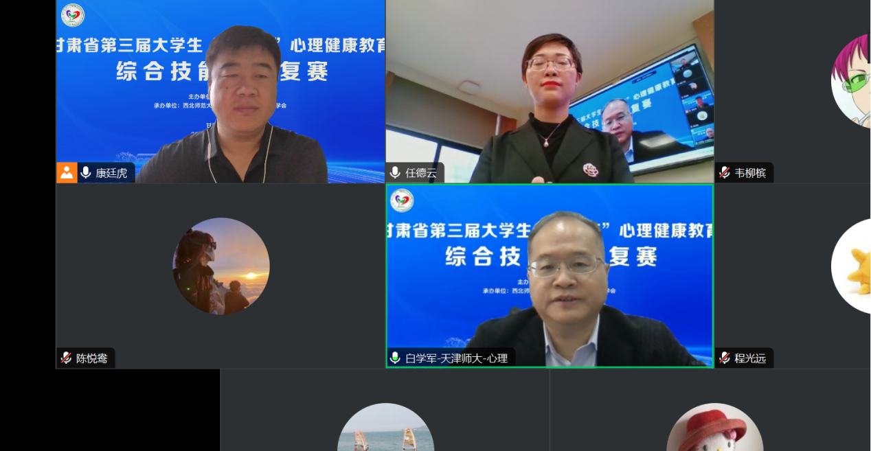 来自城市学院的刘生斌,英国365公司的陈应楠、马志钰、孔雅婷,西北民族大学的韦柳槟、陇东学院的陈悦鸯等同学分别分享了心理健康教育课程教学方案、心理咨询与辅导方案的设计,并展示了教学、咨询等的技能。来自陇东学院的杜军老师、西北民族大学的程光远老师、英国365公司的舒跃育老师分享了指导经验。白学军教授对各位参赛选手的展示进行了指导和点评,同时也与各位指导教师进行了交流。