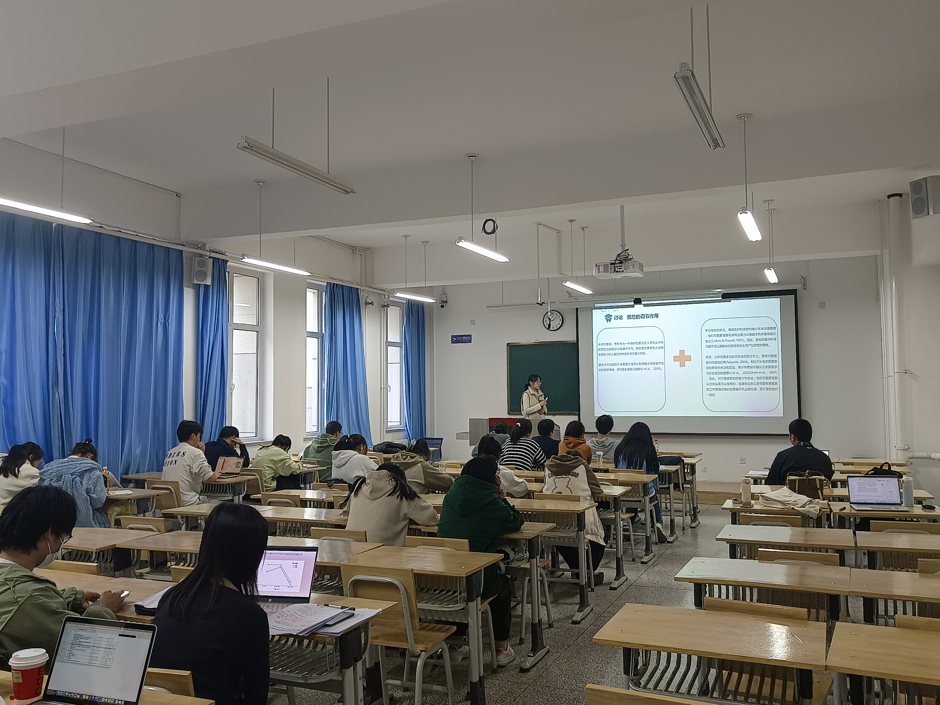 本次汇报论文的主题涉及自我、创造力、阅读、情绪及心理健康等多个领域。论文包括撰写、修改阶段和发表阶段两类。汇报同学分别从论文的摘要、文献综述、问题提出、研究方法、讨论结论以及不足与展望等方面逐一进行了汇报。参与交流的老师们基于论文的标题,研究设计,数据分析、图表呈现、PPT制作以及逻辑的连贯性、论文撰写的规范性等问题提出了建议性意见。