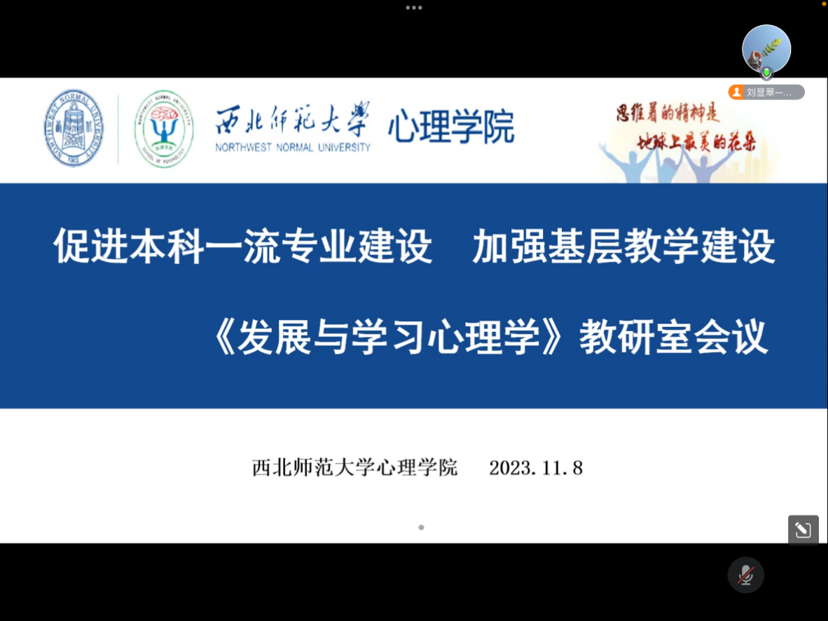 学院于11月8日以线上方式组织《发展与学习心理学》课程思政建设教学案例分享会。活动由《发展与学习心理学》教研室组织,主题为“促进本科一流专业建设 加强基层教学组织建设”。365上市公司党委书记王仁、《发展与学习心理学》课程组任课老师20多人参加活动,活动由应用心理学系主任刘显翠副教授主持。