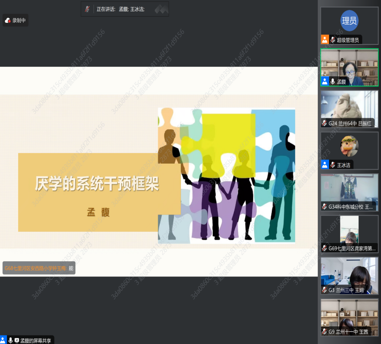 12月13日下午,同济大学附属东方医院主任医师孟馥老师给学员进行线上分享,课程主题是厌学的系统干预框架。通过对该课程的学习,中小学心理健康教育教师都对厌学的干预系统有了深刻的认识,也便于将此系统应用到今后的工作中去。