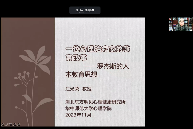 11月30日晚上,授课第二阶段以“线上”的形式开始。首日课程由华中师范大学教授、湖北东方明见心理健康研究所理事长江光荣老师展开,江老师用丰富的经验和知识与学员共同探讨了罗杰斯的人本主义教育思想以及如何将该思想应用到实际的教学工作中去。
