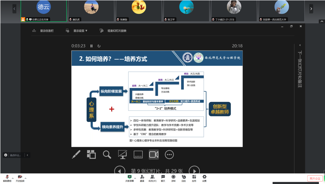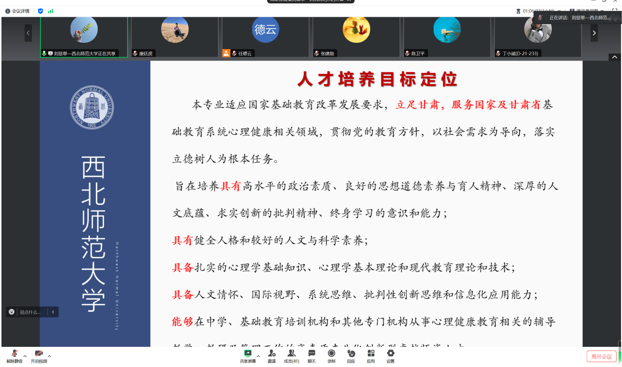 在论证会上,王刚副处长传达了学校对相关工作的安排,要求学院在方案修订过程中要充分体现学生中心、降低课程学分等,丁小斌院长结合学校的工作安排,要求心理学和应用心理学两个专业准确定位人才培养目标,以学生发展为中心,提高人才培养质量。应用心理学系刘显翠主任、心理学系任德云主任分别结合2023版的人才培养方案和学校要求,介绍了人才培养方案工作小组的组织以及方案修订的规划。