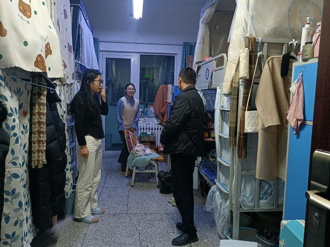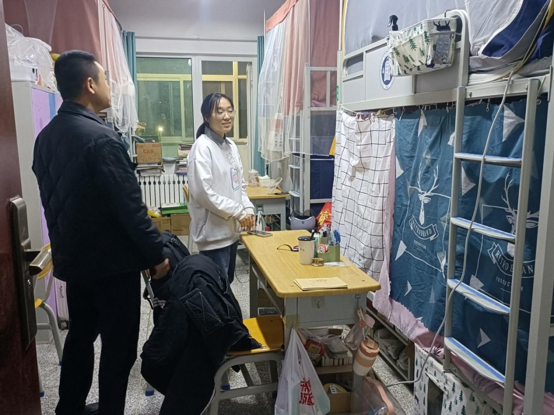 走访过程中,王老师与同学们亲切交谈,特别关注学生生活状态和学习情况,提醒学生注意防寒保暖、注意宿舍安全等,并着重了解同学们的就业情况,督促未就业的同学认真把握接下来的各种机会尽快尽好就业。