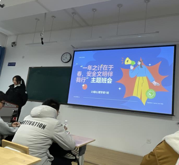 一年之计在于春,这是一个充满生机与希望的季节,也是我们制定新一年计划的关键时刻,安全是我们学习生活的重要基石。为了更好地增强同学们的安全意识,提升安全素养,从而更充分地面对生活中的各种挑战。2023级心理学类一班于2月29日上午在知行校区弘文楼215教室召开“一年之计在于春,安全文明伴我行”主题班会。本次班会由班主任尹玉龙主持召开,23级心理一班全体同学共同参与。本次班会涵盖了消防安全、生命安全、交通安全、意识形态安全等方面,具有很强的宣传性和教育意义。