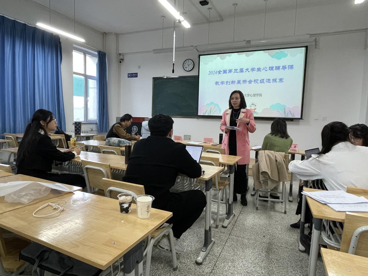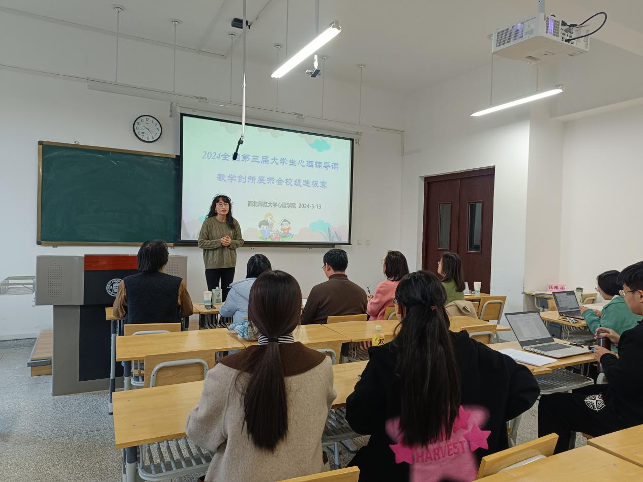 学院于3月13日在弘文楼举办了2024年全国第三届大学生心理辅导课教学创新展示会选拔赛。此次选拔以线下方式进行,旨在落实立德树人根本任务,促进心理学类专业本科生教育教学与辅导能力的提升。学院康廷虎、杨晓莉、舒跃育、张继元、陈卫平和王恩娜等老师、参赛选手与观摩活动的本科同学30多人参加活动。活动由应用心理学系主任刘显翠主持。