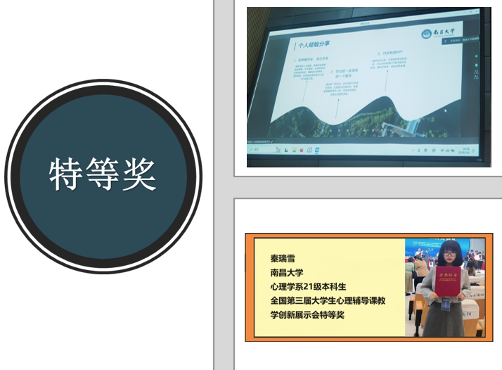 首先,来自南昌大学的21级本科生秦瑞雪同学,该同学在第三届全国大学生心理辅导课展示会上获得特等奖,秦瑞雪同学全面地介绍了自己参加此次全国大学生心理辅导课教学创新展示会的经验,并结合录课、说课和授课等参赛环节分享了自己的参赛经验,并告诉同学们要重视教学比赛中的创新。