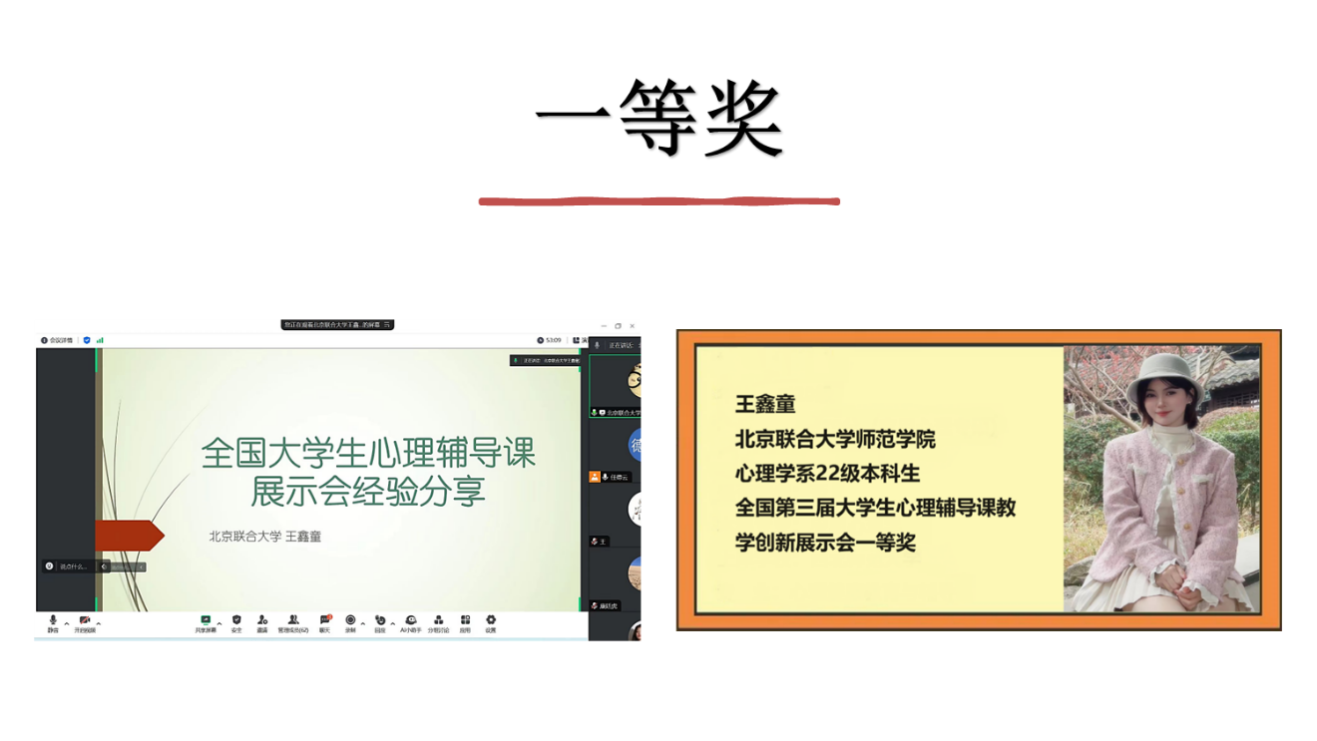 再次,北京联合大学的王鑫童同学,该同学在第三届全国大学生心理辅导课展示会上获得一等奖。王鑫童同学告诉同学要发现自己的优势区间,扬长避短,进行针对性训练。在比赛的时候要注意自身情绪,要保持自信,仪态要大方得体。