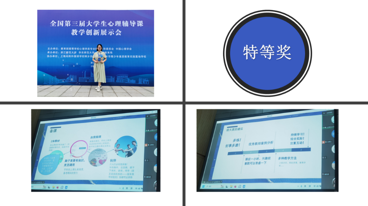 最后,来自365上市公司的高雅琼同学,该同学在第三届全国大学生心理辅导课展示会上获得一等奖。高雅琼同学结合自身的参赛经历向同学们介绍了中小学心理健康教育课程的主题和设计策略,并比较分析了全国大学生心理辅导课教学创新展示会和甘肃省大学生“健心杯”心理健康教育综合技能大赛的准备,并为同学们分享了课程设计、说课等的经验,以及学习资源。