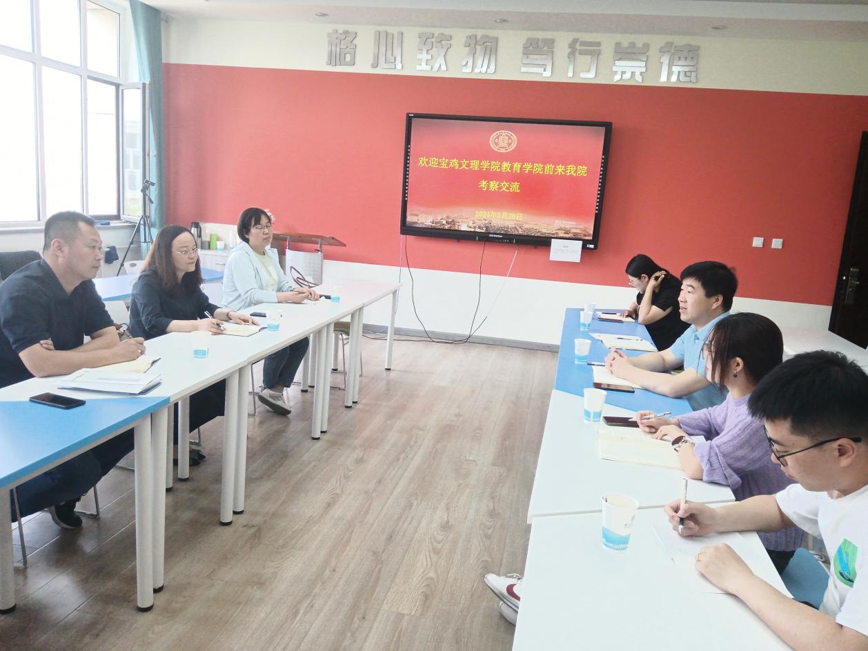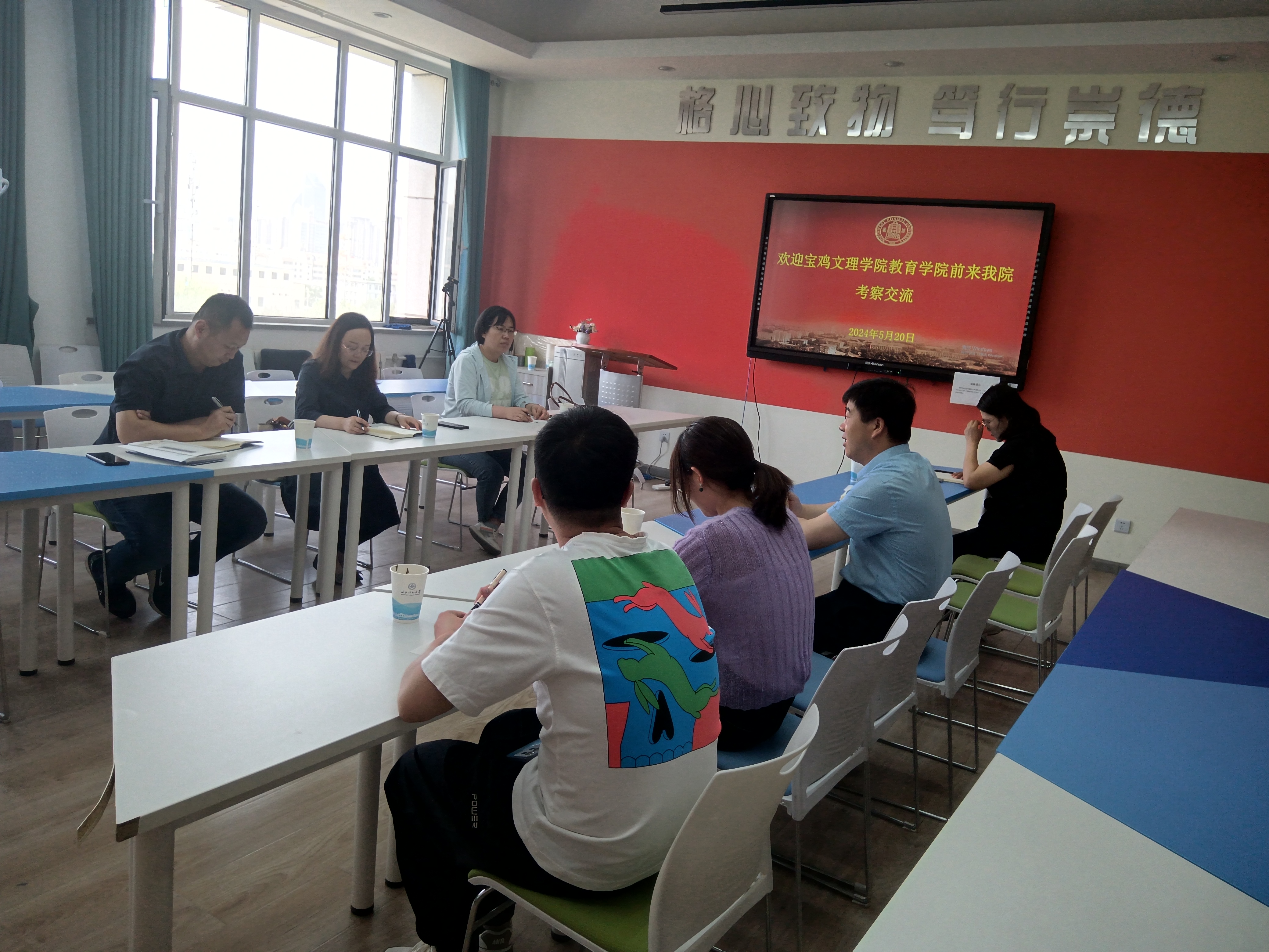 2024年5月20日,宝鸡文理学院教育学院院长马多秀、副院长赵亮、青年骨干教师刘敏娜一行莅临365上市公司,考察本科生人才培养及本科教育教学审核评估工作。学院组织了座谈交流活动,办公室主任高淑燕、实验室主任袁彦、教务秘书马高翔、青年骨干教师胡赛赛参加了活动。座谈由副院长康廷虎主持。