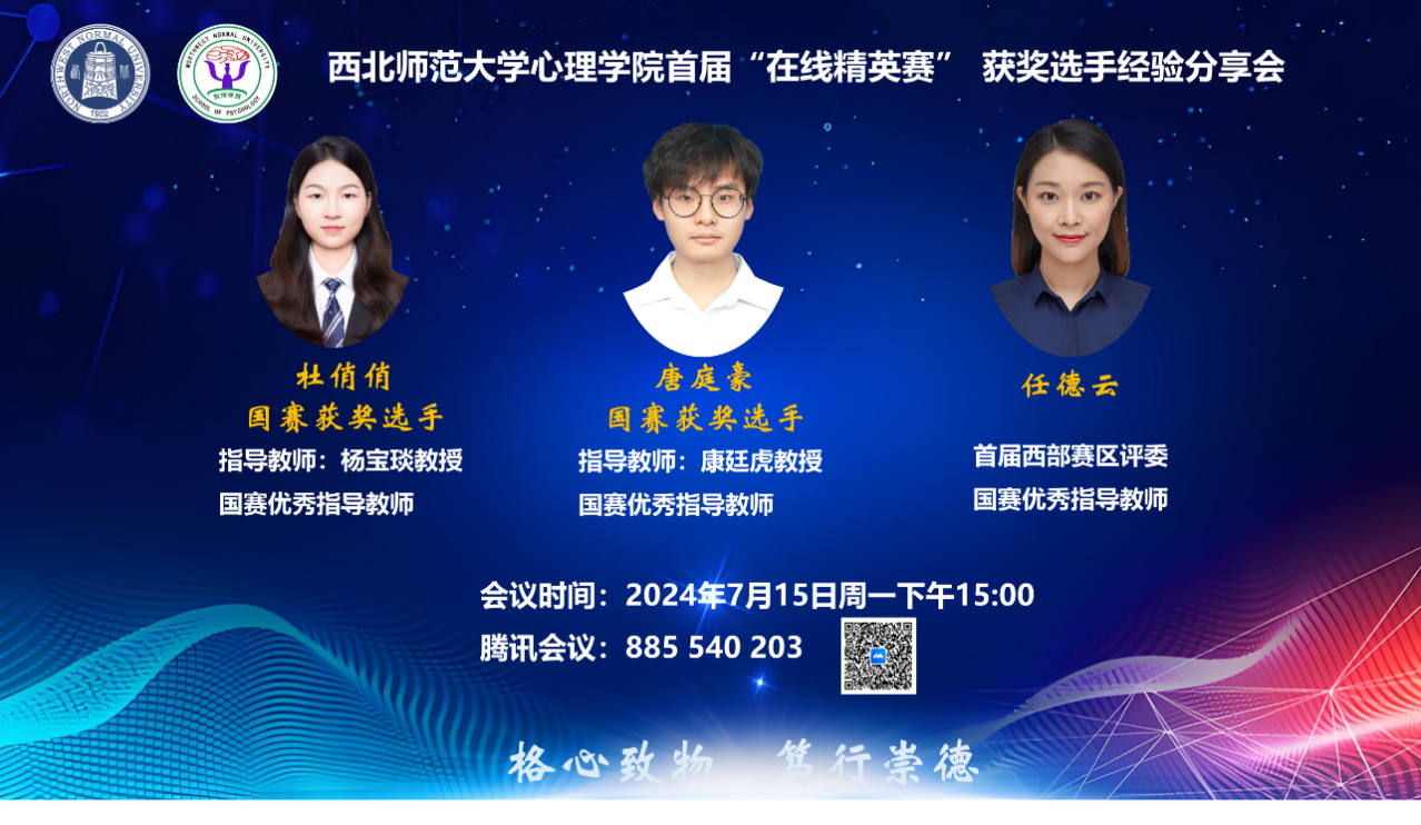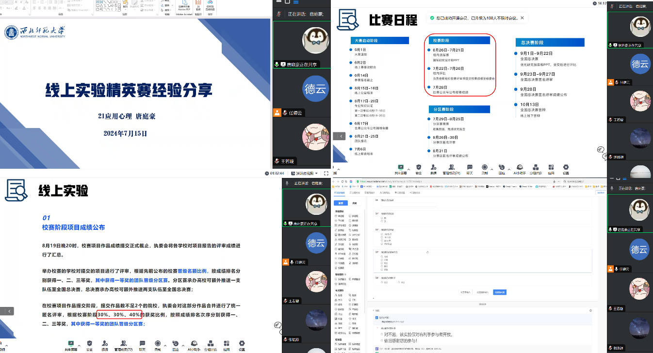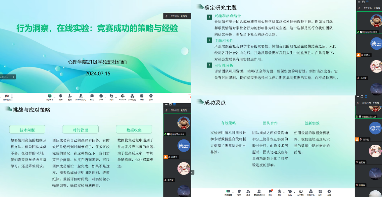 学院于7月15日以线上方式组织了全国大学生心理与行为在线实验精英赛获奖同学的经验分享会。活动邀请在首届精英赛中获得国家三等奖的唐庭豪同学、杜俏俏同学及在首届校赛和片区赛中担任评委的任德云老师为同学们做备赛经验分享。周爱保教授、康廷虎教授与80多名本科生参加了此次线上分享会,活动由任德云主任主持。