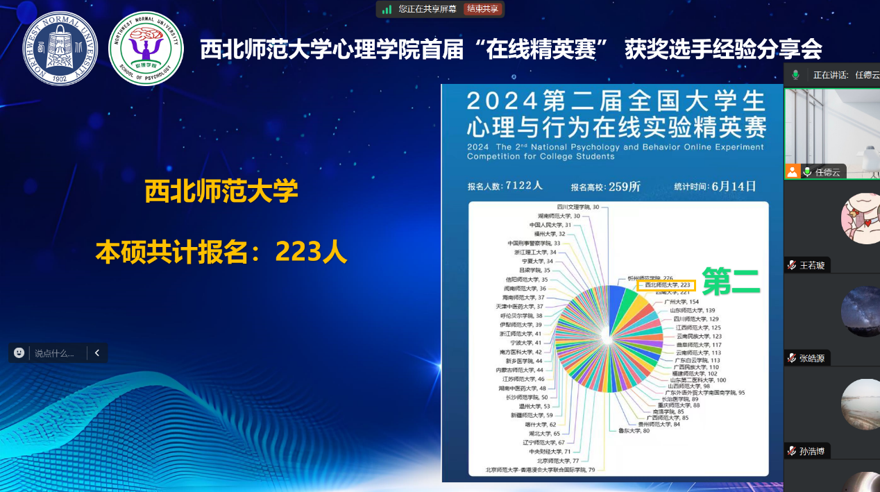 任德云主任介绍了学院学生在第二届全国大学生心理与行为在线实验精英赛中的报名情况。截至6月14日,学院共有223名本硕同学踊跃报名参赛,在全国259所参赛高校中排名第二。