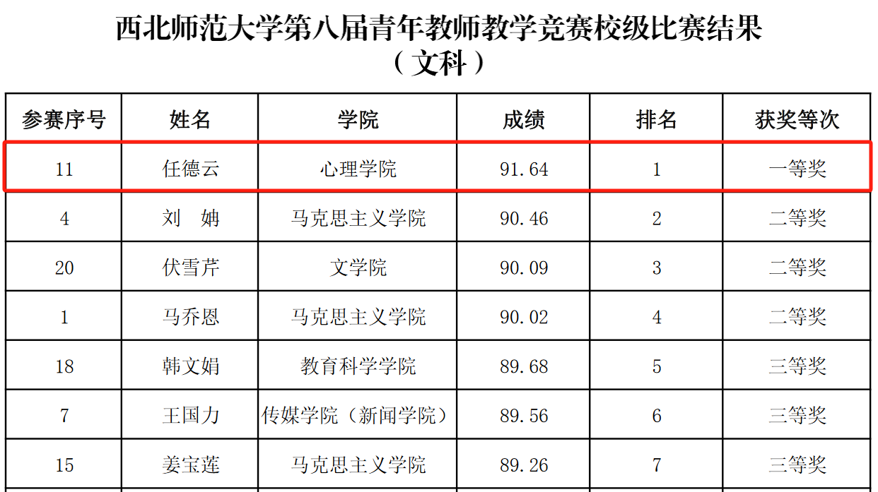 6月23日,任德云老师代表学校参加了由甘肃省总工会和甘肃省教育厅联合主办的第七届甘肃省高校青年教师教学竞赛并荣获文科组竞赛三等奖,成为学院继舒跃育教授之后青年教师在全省高校青年教师教学技能大赛中获得的重要荣誉。