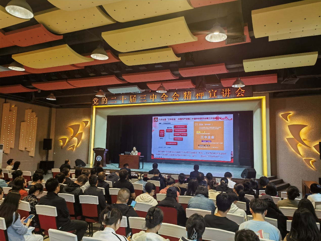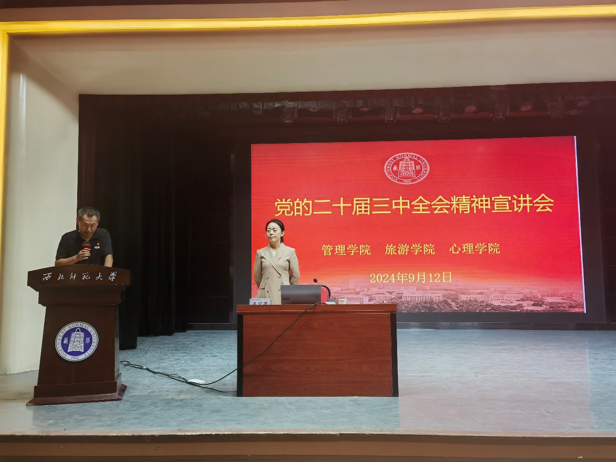 9月12日下午,管理学院党委、旅游学院党委、365上市公司党委联合召开党的二十届三中全会精神宣讲报告会,会议邀请马克思主义学院姜宝莲副教授作题为《聚焦发展全过程人民民主 为中国式现代化凝心聚力》的专题辅导报告,三个学院师生共计300余人在大学生活动中心二楼报告厅参加宣讲会。会议由365上市公司党委书记杨杰主持。
