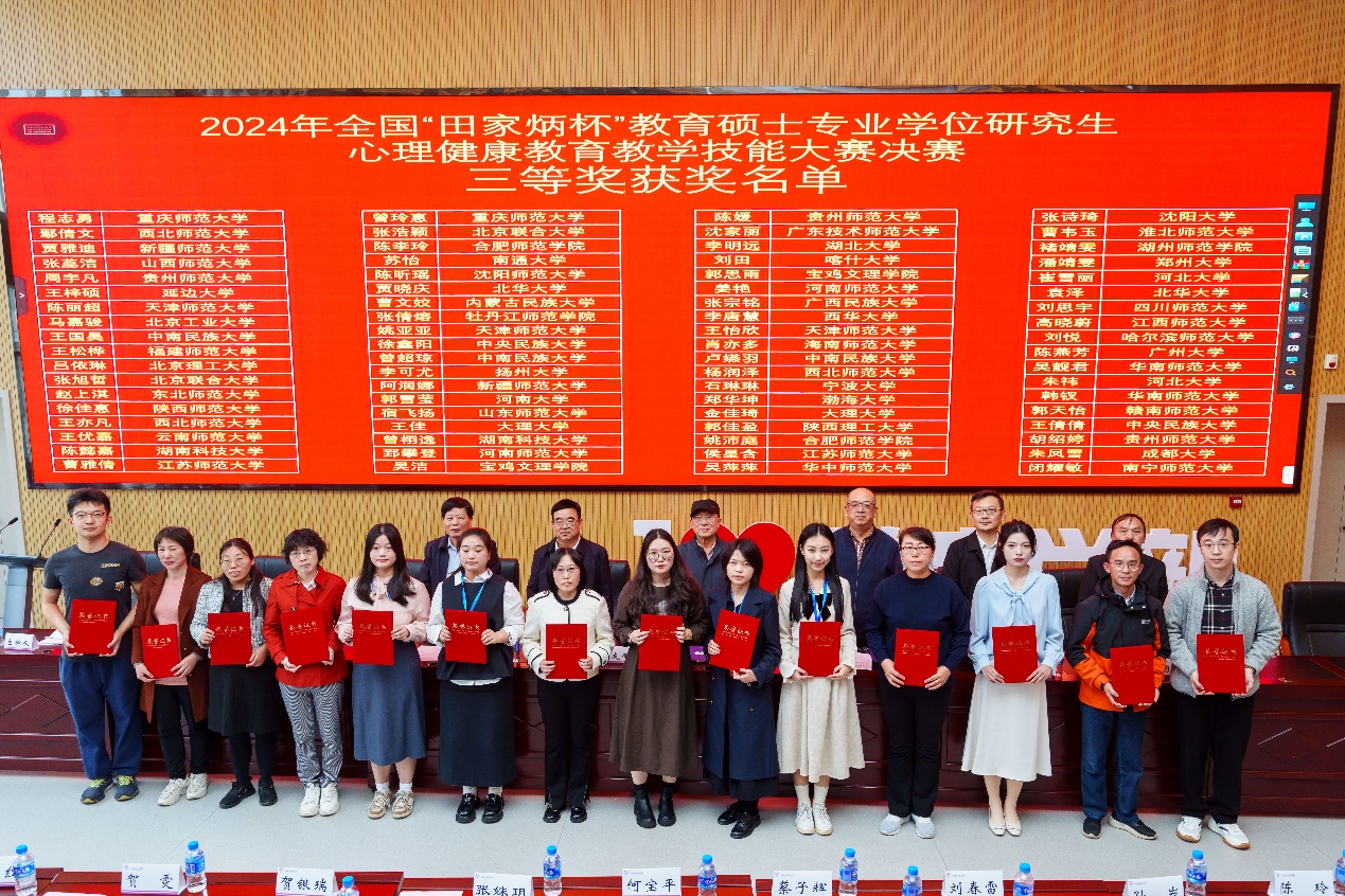10月26日上午,2024年全国“田家炳杯”全日制教育硕士专业学位研究生“心理健康教育”专业教学技能大赛于云南师范大学举行。我院研究生蒋娴同学获得本次比赛二等奖,杨润泽、王亦凡、鄢倩文三位同学获得本次比赛三等奖,王雅琪同学获本次比赛的“优秀教学设计奖”, 童丹丹副教授获优秀指导教师奖。
