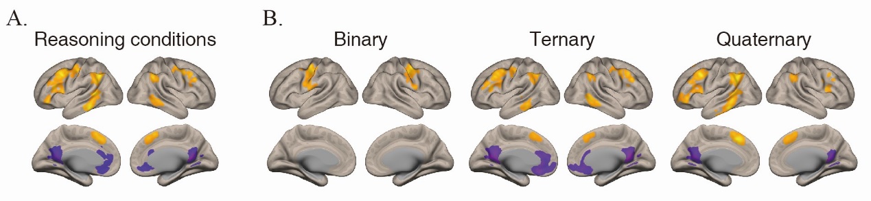 王宴庆博士利用7T fMRI公开数据集,采用拉丁方格任务(类似于数独游戏)作为认知推理任务进行了实验。在该任务中,每个试次呈现一个包含不同几何形状(如正方形、圆形、三角形或十字形)的4 x 4矩阵。参与者需要根据“每个形状在每行和每列中只能出现一次”的规则,推理出目标位置的刺激。任务通过改变矩阵的复杂性来调整难度:在低难度条件下,参与者仅需在单行或单列中整合信息进行推理,而在高难度条件下,则需要整合来自多个行和列的信息进行推理。
