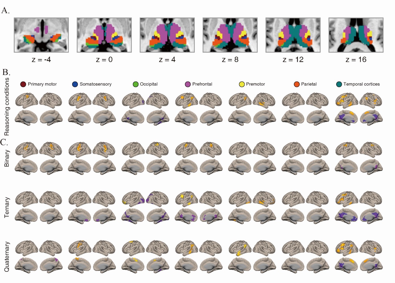 研究结果发现,随着推理任务难度的增加,丘脑的激活程度和与皮层区域的连接强度也随之增加(如图1)。此外,丘脑的不同亚区在推理过程中表现出与特定皮层区域的不同连接模式,这些模式随着任务难度的增加而变化(如图2)。这表明,丘脑亚区在支持认知推理方面发挥着独特的功能。