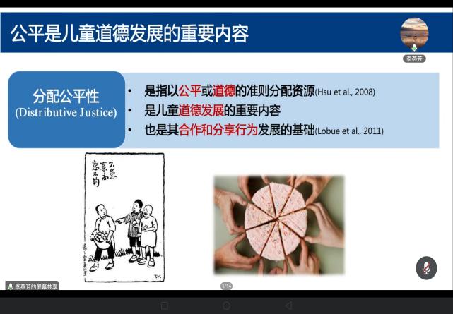李燕芳教授首先介绍了公平的概念及其对儿童道德发展的重要性。随后,她介绍了Damon的分配公平认知发展理论,并结合已有研究深入阐述了儿童公平分配的发展规律。紧接着,李教授借助社会推理发展模型这一理论框架,从三个维度——即公平道德的内在驱动、群体互动的动态过程,以及对他人心理状态的敏锐洞察,分析了复杂社会情境如何作用于儿童的公平分配行为。最后,李教授从群体关系、人际互动和社会地位等角度出发分析了对儿童公平分配行为的影响。