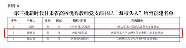 学院教工党支部书记康廷虎同志担任支部书记以来,坚持强化党支部政治功能,努力抓好党建主责主业,提升思想政治工作质量,推进党建业务相融合,先后组织支部党员学习和领会习近平新时代中国特色社会主义思想、全国教育大会精神,探索AI技术赋能教师专业发展、教师学术研究融入学生培养,动员教师党员发挥先锋模范带头作用,优化本科专业,为教育强国建设贡献力量。日前,中共甘肃省委教育工作委员会公布第三批新时代甘肃省大中小学党建“对标争先”培育创建单位名单,康廷虎同志入选第三批新时代甘肃省高校优秀教师党支部书记“双带头人”培育创建名单。