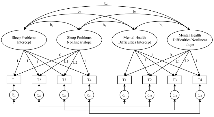 为探讨青少年早期睡眠问题与心理健康之间的共同发展,使用平行潜变量增长模型(the parallel latent growth models)从初始水平和变化速度两方面考察青少年期间睡眠问题的发展与心理健康困难(包括内化症状和外化症状)之间的发展关系。结果表明,睡眠问题的截距与内化和外化症状的截距均呈显著正相关。这些截距相关性表明,较高的初始睡眠问题水平与较高的基线心理健康问题相关。此外,睡眠问题的斜率与青少年内化和外化症状的斜率呈正相关,表明睡眠问题的快速增加与青少年内化和外化症状的快速增加相对应。