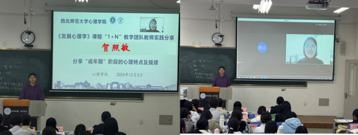大部分学生处于18岁左右,对成年早期的心理特点比较熟悉,为了让学生更好地了解成年中期和晚期个体的心理特点和表现,课程先后邀请了中年和老年代表进行了实践体验分享。2024年12月3日邀请长春财经学院贺照敏老师作为成年中期的代表,分享人在成年中期阶段的心理特点和规律。贺老师也分享了自己“40不惑”,作为中年人上有老下有小的人生感悟等,学生则根据课本所学成年阶段的理论知识,向聂老师咨询该阶段的人在实际生活中的心理发展特点和规律。