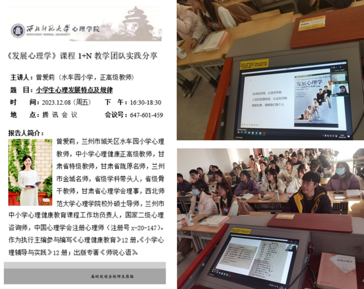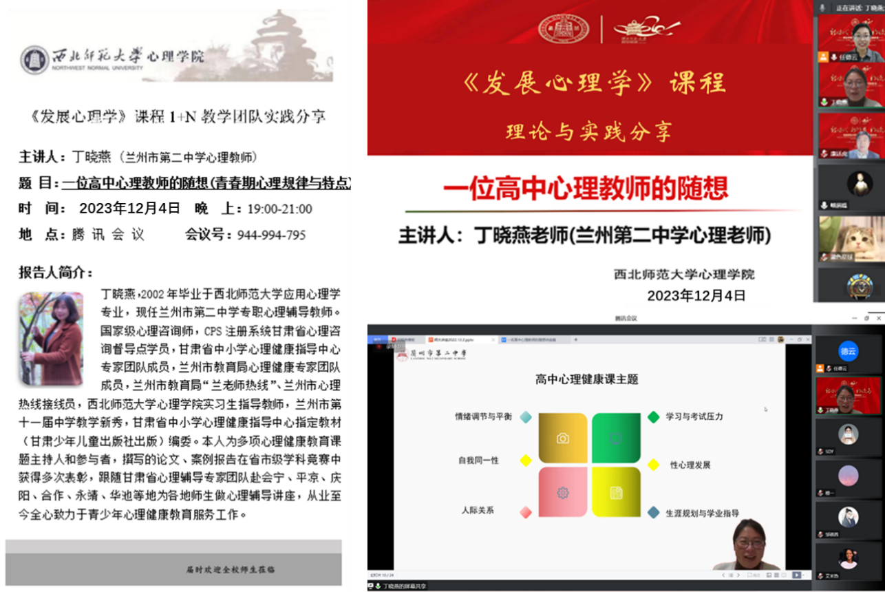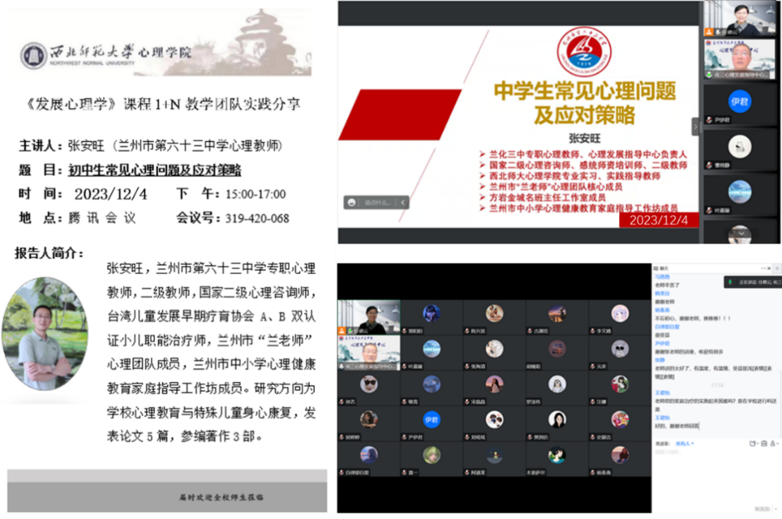 11、12岁-17、18岁正处于青春阶段,这一时期孩子表现的心理特点明显,心理问题较多,我们先后邀请了多名初中至高中的教师分享青春期孩子在实践中的表现。2023年12月4日下午,任老师邀请兰州市第六十三中学专职心理教师张安旺老师,张老师基于自己多年的工作经验,介绍中学生常见的心理问题以及鉴别的方法。张老师通过引入实践工作案例,系统地讲解了对应中学生心理问题的对策。张老师分享结束后,同学们还与张老师进行了互动交流,回答了同学们提出的有关学校开展心理健康教育工作的问题,比如如何应对青春期学生的冲动性,在教学过程中初中生经常表现出哪些心理问题等。