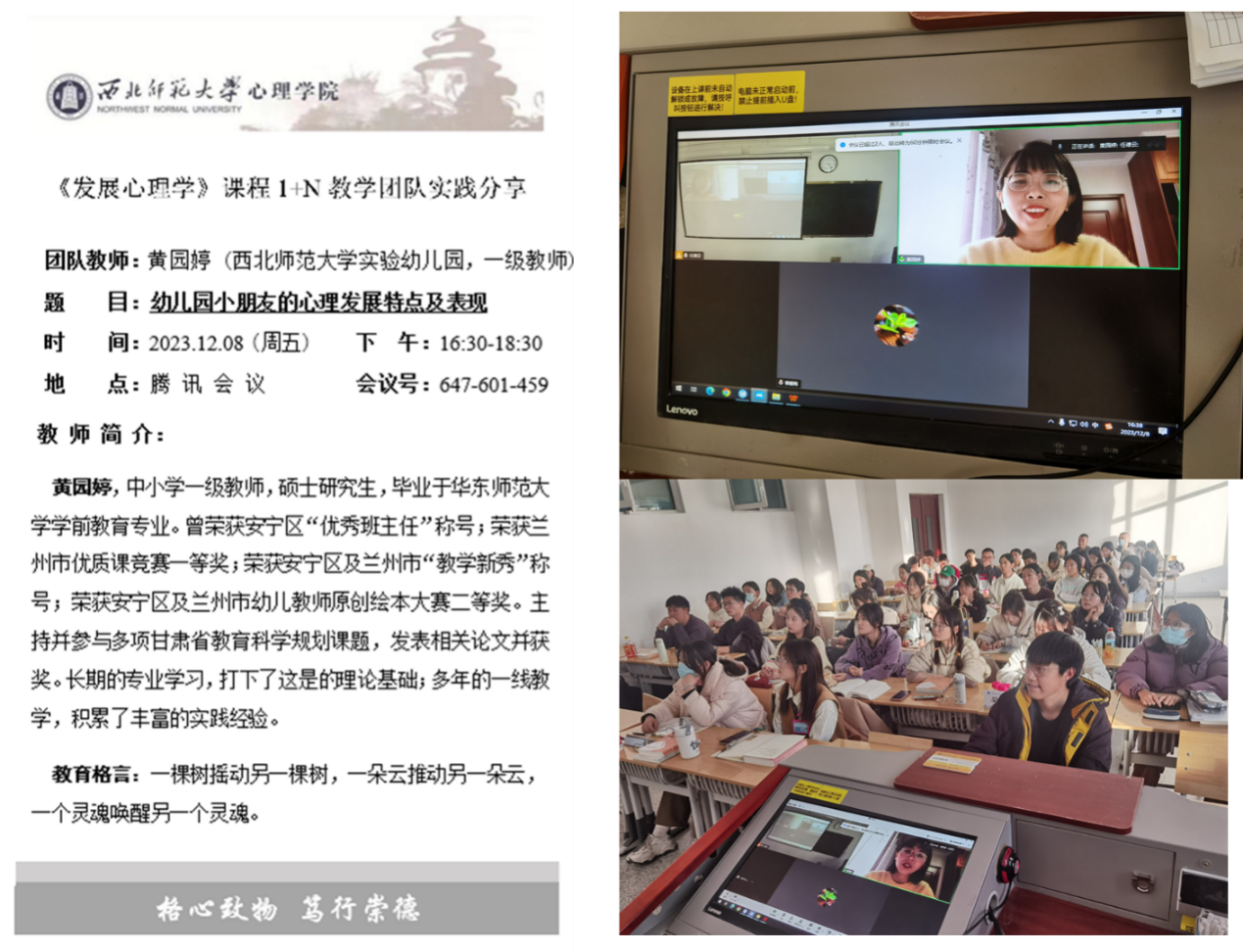 2023年-2024年,任德云老师作为《发展心理学》课程主讲教师,先后邀请了幼儿妈妈、中小学老师及成年人代表等20余名实践指导教师,并邀请了近10余名实践指导教师直接参与到《发展心理学》的课堂教学中,进行实践经验的分享和答疑。