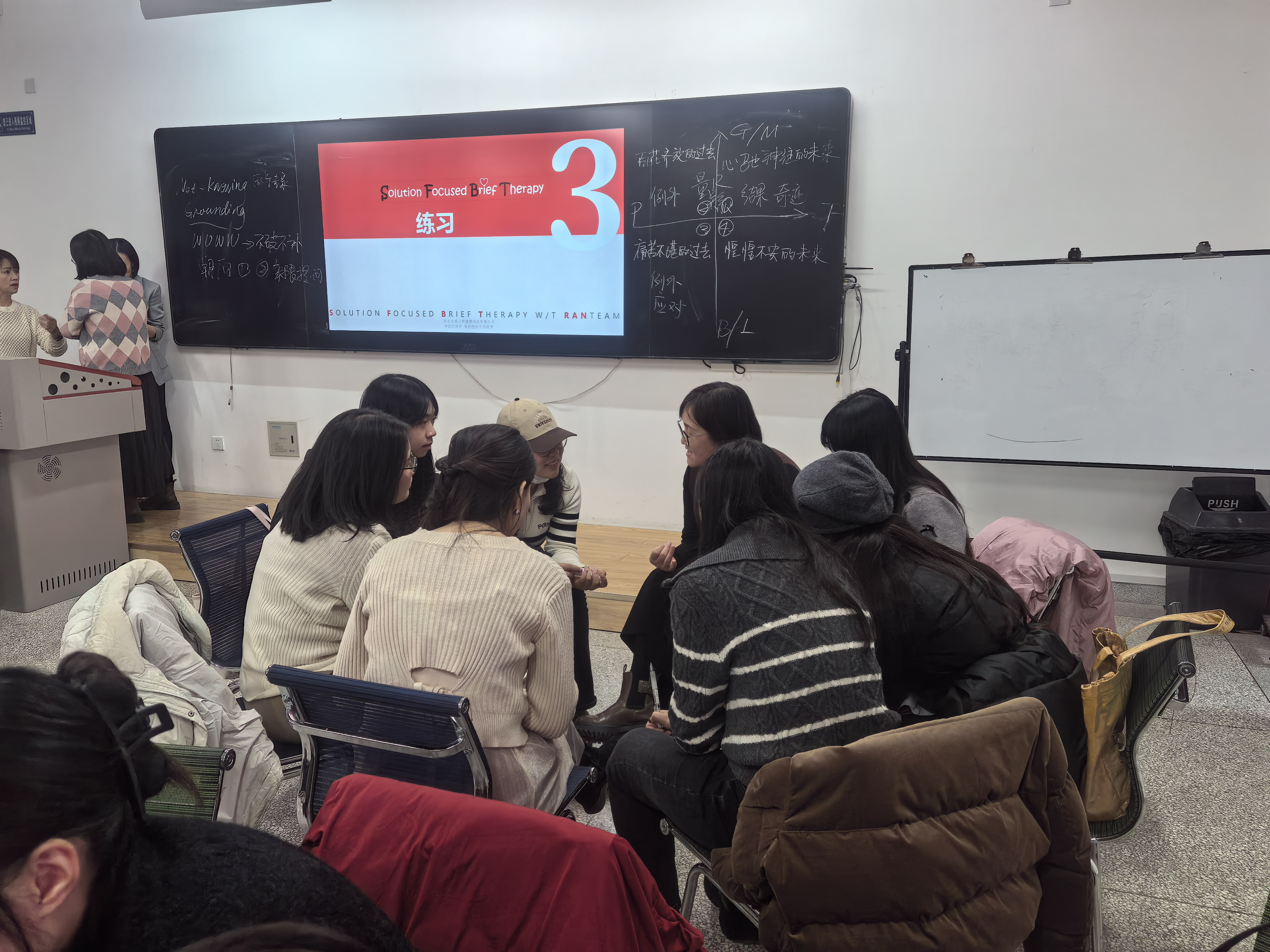 实战演练环节,更是将同学们紧密的联系在一起。在老师们的指导下,同学们时而2人一组,时而4人一组,分组进行角色扮演,通过模拟咨询场景,亲身体验了焦点解决短程治疗的实际操作。在咨询师的角色里,大家反复打磨自己的技术和语言,全力以赴只为提升自己的咨询技能;在来访者的角色里,试着配合与咨询师一同探索、成长。那一刻,情感的交融,让同学们彼此更加理解,更加亲近。