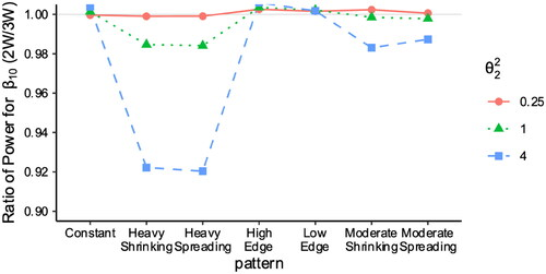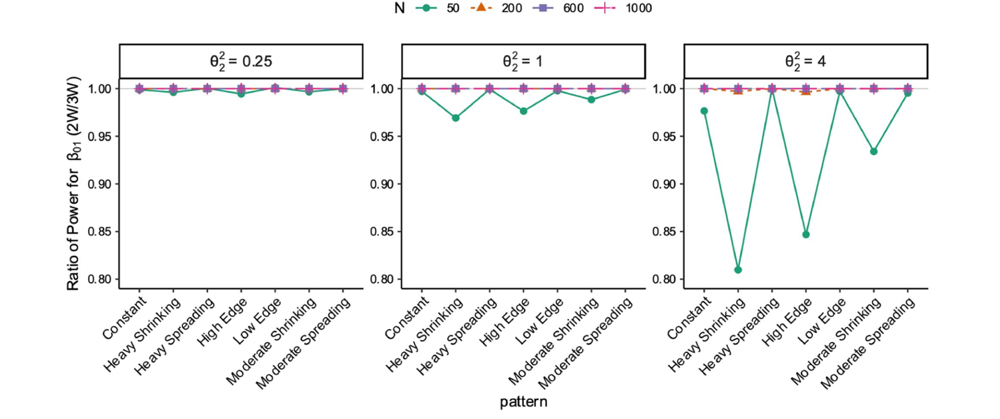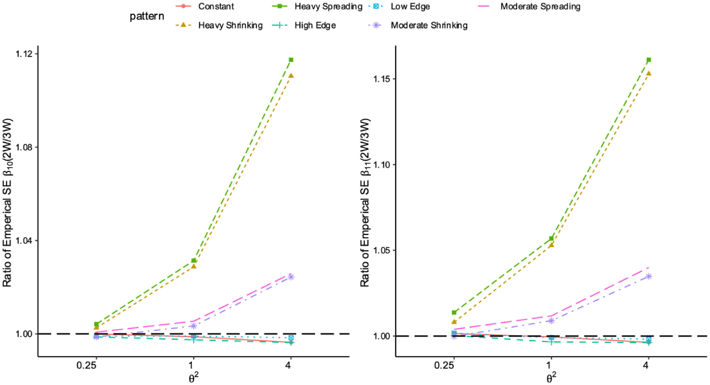 近日,英国365公司杜晨光博士,日本教授Kazuki Hori (一辉君) 和美国教授Yasuo Miyazaki( 宫崎君),联合在国际著名期刊Structural Equation Modeling: A Multidisciplinary Journal 发表了一项题目为“Two-Wave Models for Latent Changes: How Well Can They Recover the Parameters of the Three-Wave Growth Curve Model“的研究 。该研究通过数学推导和模拟试验的研究方法,考察了在不同条件下(包括样本量大小,固定截距和固定斜率,随机效应方差,时间特征残差大小,以及时间特征残差的变化方式),三波模型(3W-SOLGM)的固定效应可以从双波模型的参数估计中恢复的程度。结果表明: (1)当在线性增长的假设前提下,双波纵向共同因子模型(2W-LCFM)和双波潜变化得分模型(2W-LCSM)能够无偏地估计(No Bias)三波二阶潜增长模型(3W-SOLGM)的固定效应;(2)当时间特征残差(Time-specific residual variance)逐渐增大时,双波模型与三波模型经验标准误(Empirical Standard Error)的比例值在某些变化趋势下(Heavy Shrinking 和 Heavy Spreading)会逐渐变大(如下图所示),同时统计效能也会随之降低(最高损失可到达20%)。