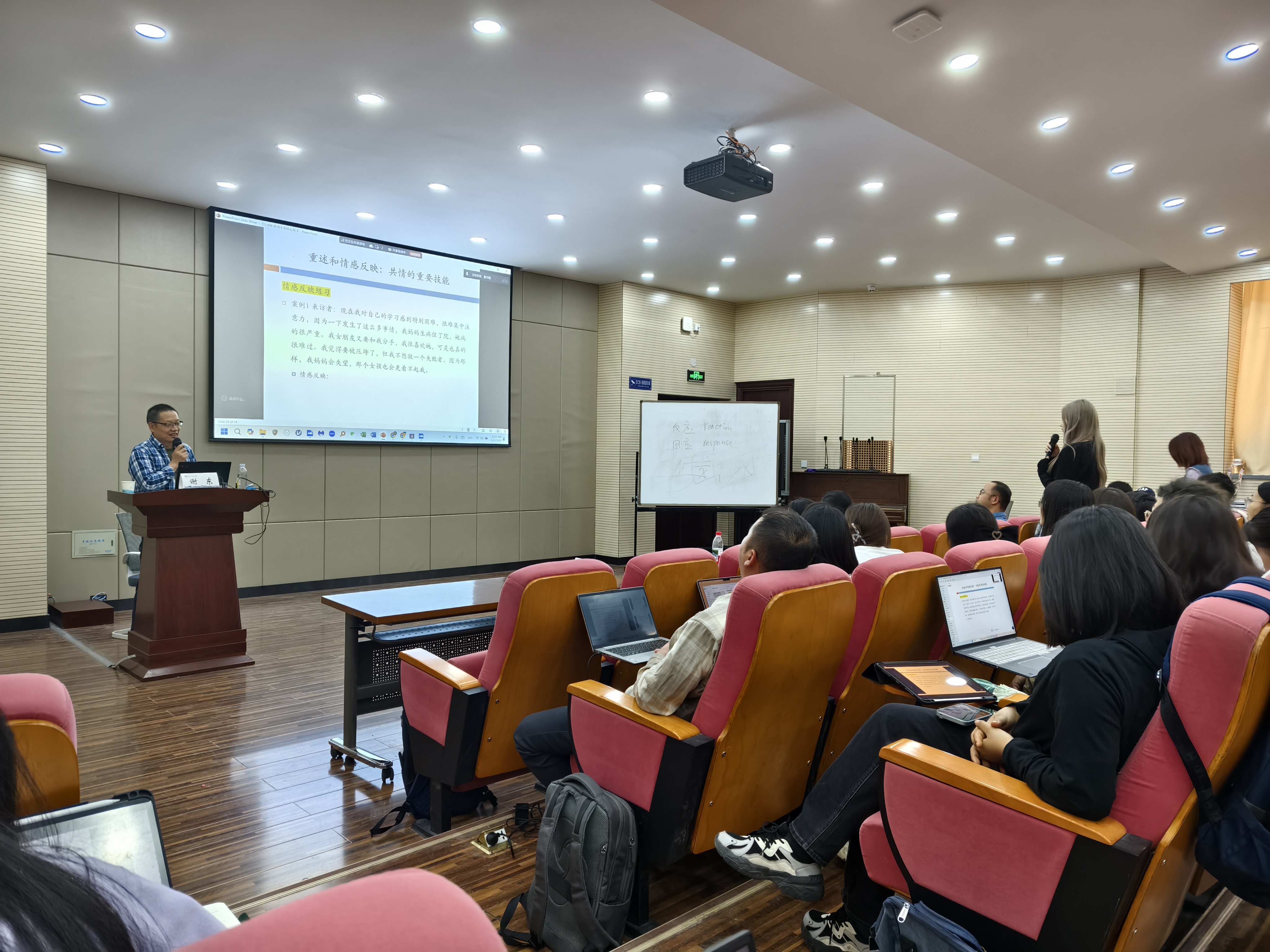 5月22日上午,谢老师首先对心理咨询的发展趋势展开了系统且全面的梳理。他指出,当前心理咨询领域呈现出诸多新态势:传统咨询理论不再成为主导;共同因素理论兴起;业界对咨询关系的重视程度与日俱增;循证治疗历经从实证研究到基于证据实践的发展历程;多元文化心理咨询兴起并蓬勃发展;行为主义治疗的发展;基于来访者优势或资源的咨询模式崭露头角;动机式访谈、整合医疗模型等技术也开始得到关注。谢老师强调,咨询关系作为核心技术的载体,其中诸如重述、情感反映、即时化等核心技能,宛如连接理论与实践的桥梁,对干预效果有着直接且关键的影响。