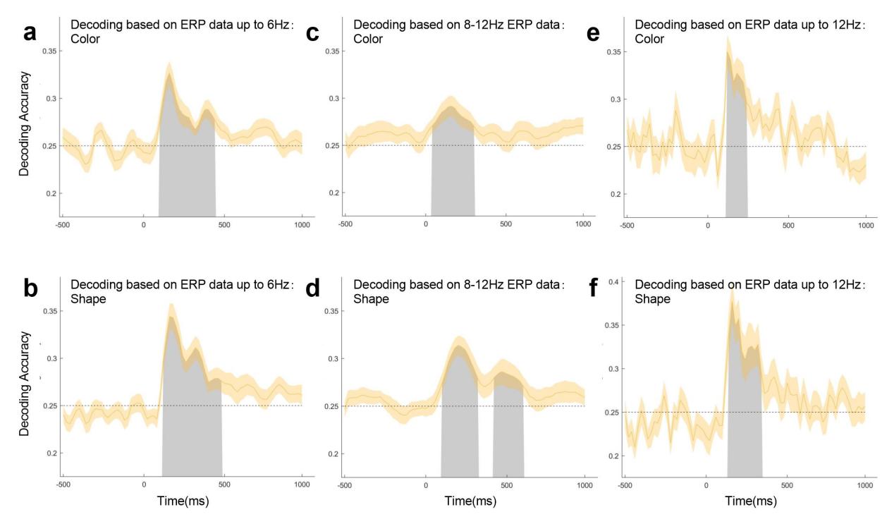 最令人瞩目的发现来自多变量模式分析(MVPA)的结果。结果显示,即使在不同滤波方式处理后的脑电图数据中,被试所记忆的具体颜色值和形状值仍能被显著解码。这意味着,工作记忆中的特征细节不仅被大脑存储,还以跨频率的分布式神经模式进行编码——甚至隐藏在以往认为“仅与空间信息相关”的alpha频段中。
