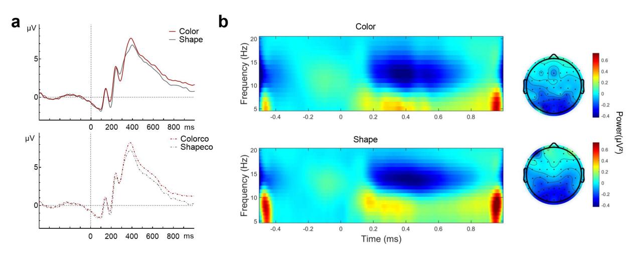 研究者采用变化觉察任务,让被试记忆屏幕中央呈现的具有不同颜色和形状的物体,并在后续探测阶段判断特征是否发生变化,在任务过程中记录被试的脑电图信号。行为结果首先显示,被试对颜色的报告不仅速度更快,准确率也显著高于形状,表明颜色在工作记忆的重新选择中具有优先性。这一行为差异在大脑活动中得到了进一步呼应:ERP分析发现,颜色刺激可诱发更大波幅的P300成分,该成分位于后部头皮区域,与工作记忆的信息维持与处理密切相关。然而,在alpha振荡活动上,颜色与形状并未引发显著差异。