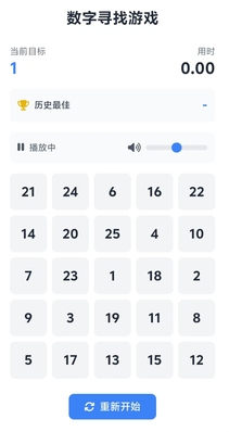 数字捕手:舒尔特极速挑战 挑战规则 1.这是一个5*5的表格,需要参与者以最快速度依次找到1-25 2.点击右方文件开始挑战 |