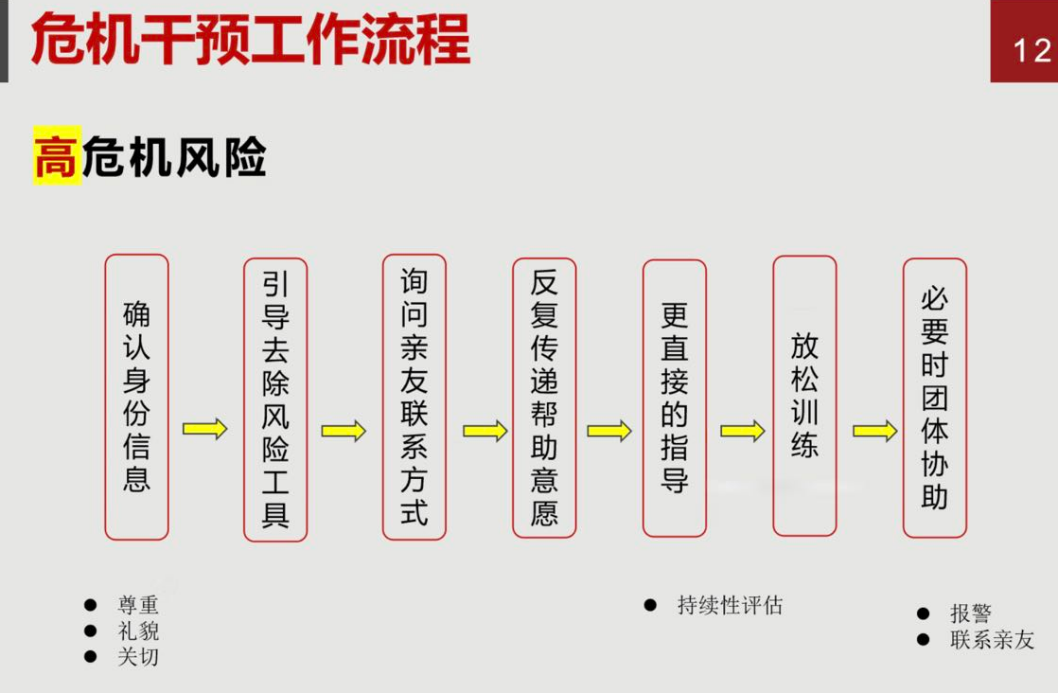 当事人在现场时,第一时间实施急救,让当事人的情绪稳定下来,给他提供一个安全的环境。无论提供一杯热水或是真诚的关心,都能给予当事人一些抚慰。另外,如果是已经实施了,比较危机的情况,涉及安全问题,以救命为主。