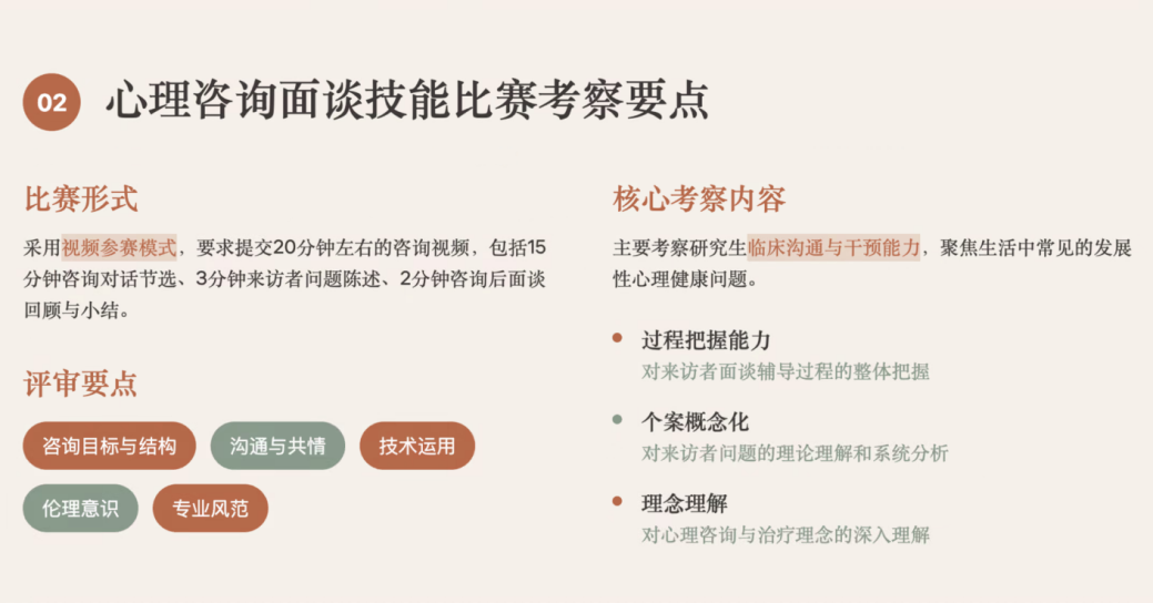 分享会伊始,汪苗毅老师系统介绍了大赛的权威性与激烈程度,由于比赛要求很高,学生们的知识和技能都需要有一定的积累。作为国内应用心理专业最高级别的赛事,去年吸引了全国125所高校的400余件作品同台竞技。汪老师详细梳理了从校内初选到全国决赛的完整赛程,并指出,初赛的核心是提交一份20分钟的咨询演示视频,其关键在于案例的真实性与可操作性,以及咨询师在短时间内展现出的共情、技术与概念化能力。