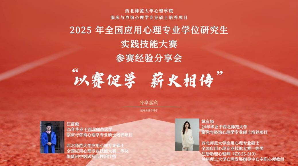 本次特邀两位从项目毕业,且曾在全国应用心理专业学位研究生实践技能大赛中,分别荣获一等奖的姚有娟老师和二等奖的汪苗毅老师作为分享嘉宾,并且全体学生参会。本次分享会旨在为本次参赛同学及未来有意参赛的同学们带来全面、深入且实用的参赛指南。